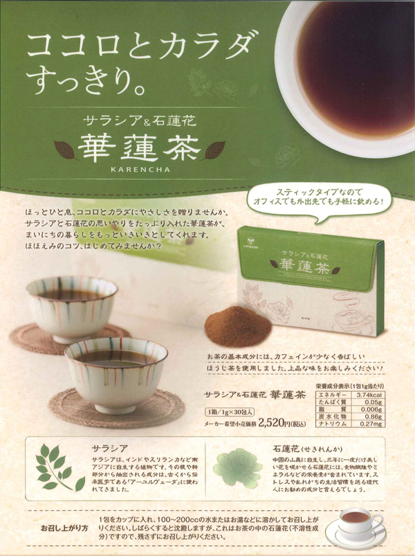 今話題のサラシアとダイエット効果のある石蓮花を配合した「華蓮茶」の販売を行っています。